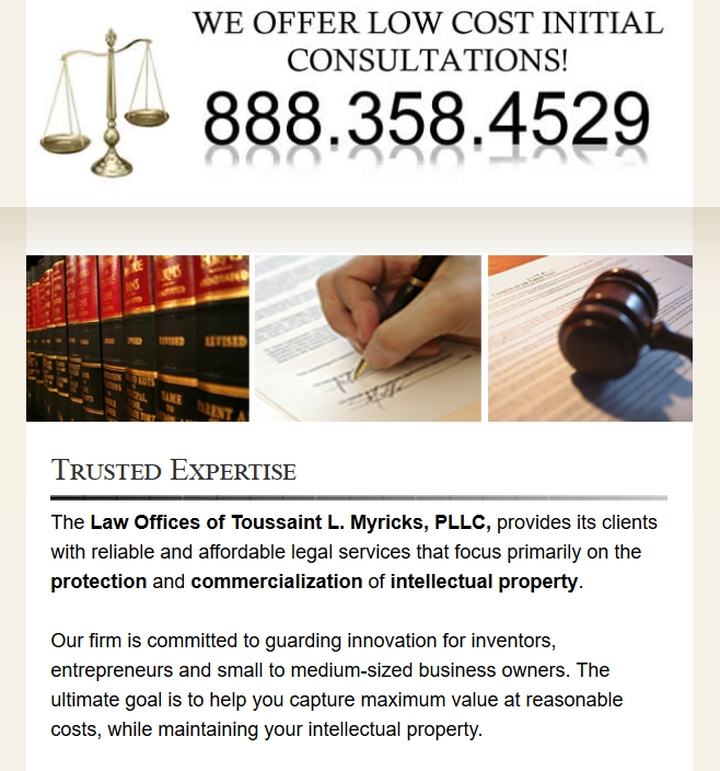 The Law Offices of Toussaint L. Myricks, PLLC, provides its clients with reliable and affordable legal services that focus primarily on the protection and commercialization of intellectual property.